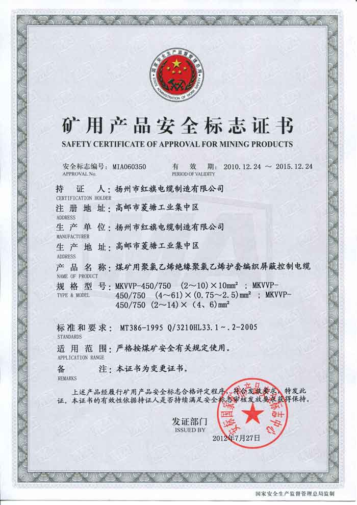 煤礦礦用產(chǎn)品安全標(biāo)志證書(shū)-MKVVP