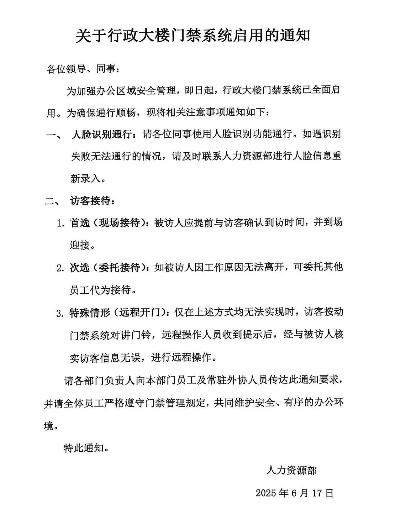 關于行政大樓門禁系統(tǒng)啟用的通知
