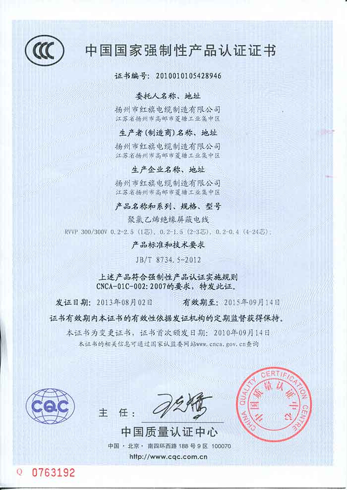產(chǎn)品“CCC”安全認證證書(聚氯乙烯絕緣屏蔽電線)