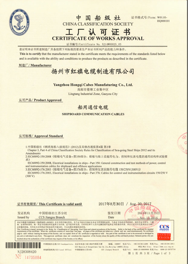 中國(guó)船級(jí)社工廠(chǎng)認(rèn)可證書(shū)(船用通信電纜)