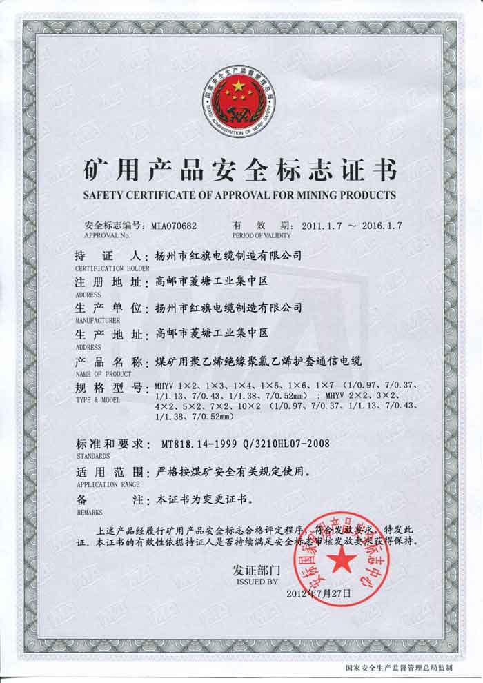 煤礦礦用產(chǎn)品安全標(biāo)志證書-MHYV