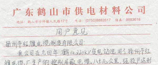 廣東鶴山市供電材料公司對(duì)我公司產(chǎn)品質(zhì)量和幫助解決工程設(shè)計(jì)問(wèn)題的贊譽(yù)
